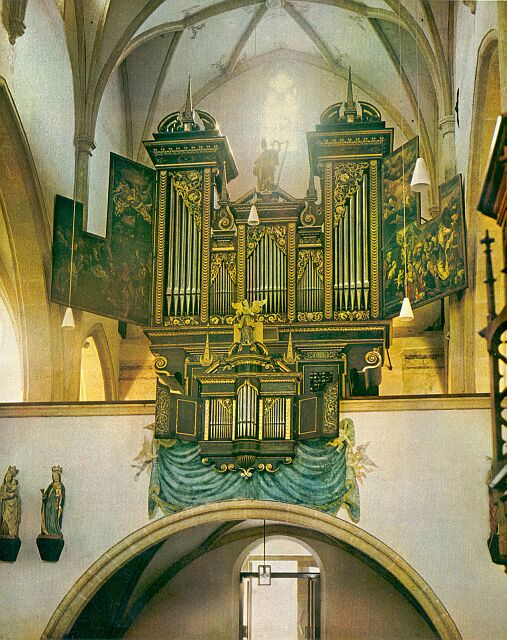 Rückpositiv: Gedeckt 8′, Prinzipal 4′, Rohrflöte 4′, Oktav 2′, Quint 1 1/3′, Cimbel, Krummhorn 8′.