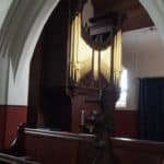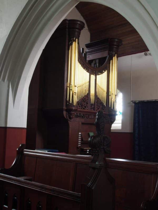 Manual: Contra-G – f3 Open Diapason (1) 8′ (TC), Open Diapason (2) 8′ (TC), Stop Diapason 8′ (TC), Stop Diapason Bass 8′ (C-B), Keraulophon 8′ (TC), Principal 4′, Gemshorn 4′ (TC), Twelfth 2 2/3′, Fifteenth 2′, Sesquialtera 2 ranks, Cornet 5 ranks (TF), Trumpet 8′.