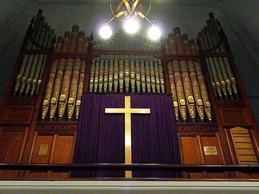 Swell: Lieblich Bourdon 16′, Violin Diapason 8′, Rohr Flute 8′, Salicional 8′, Voix Celeste 8′, Gemshorn 4′, Mixture III, Oboe 8′, Horn 8′, Tremulant.