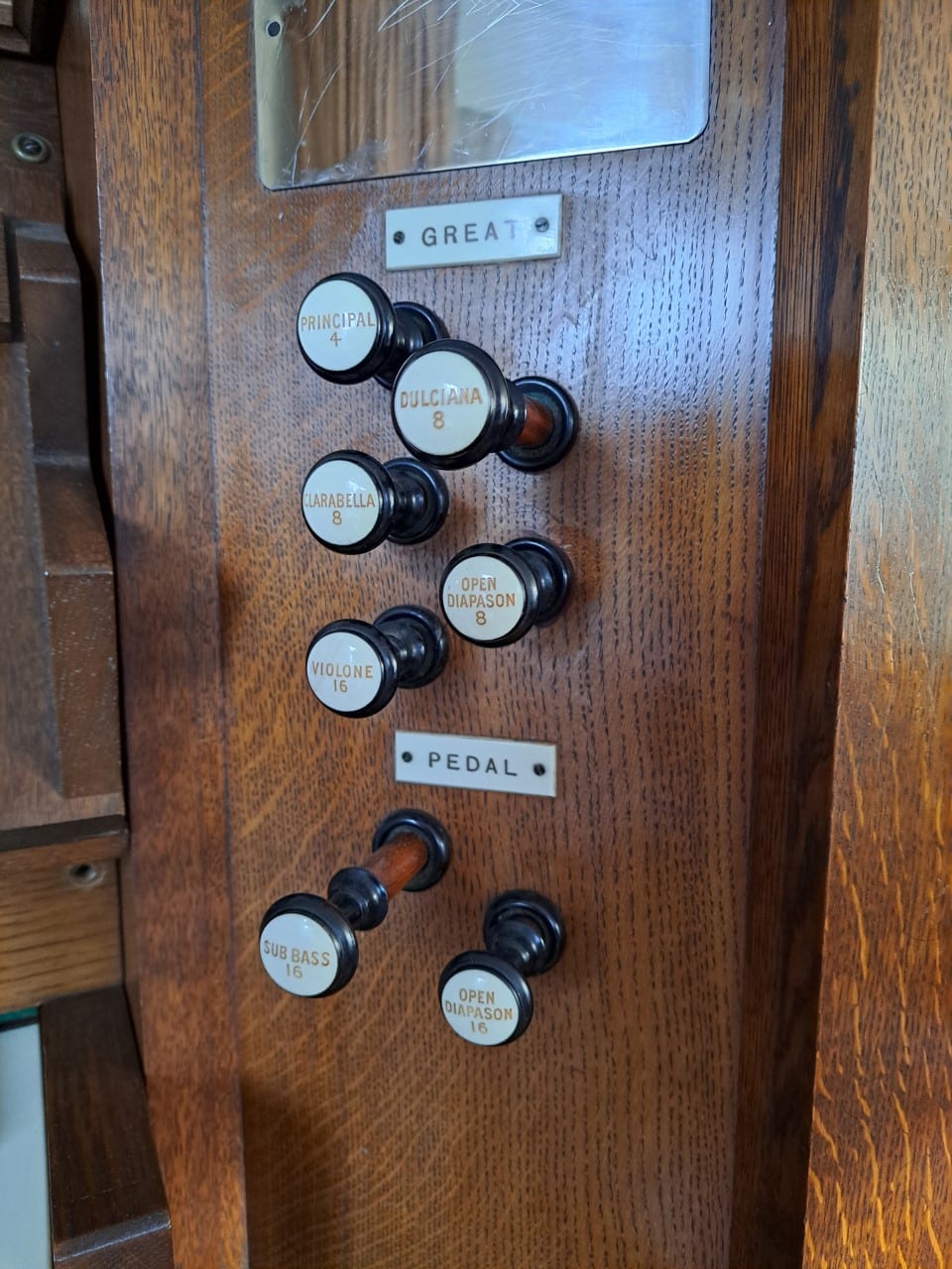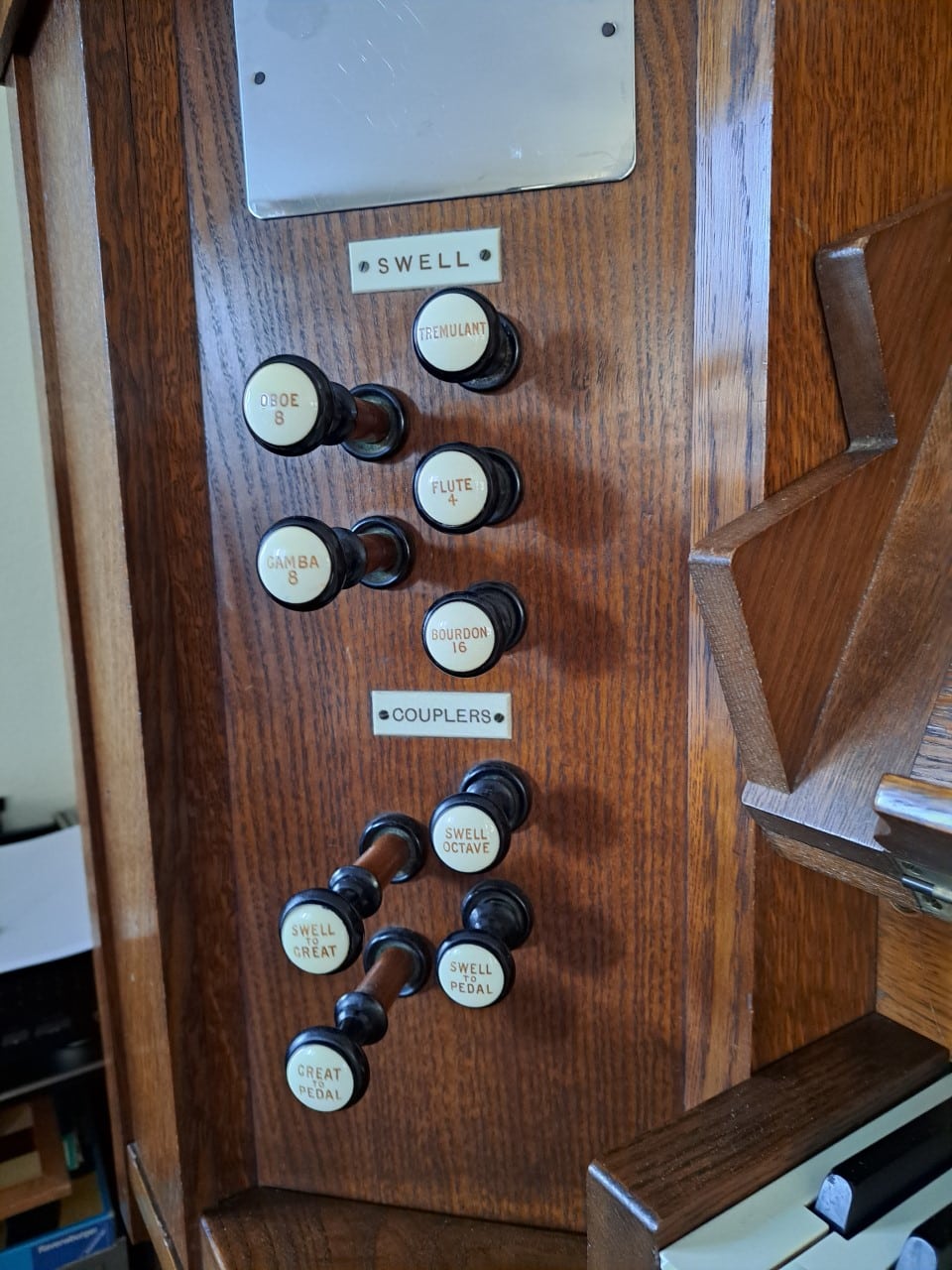 Couplers: Swell to Great, Great to Pedal, Swell to Pedal, Swell Octave.
