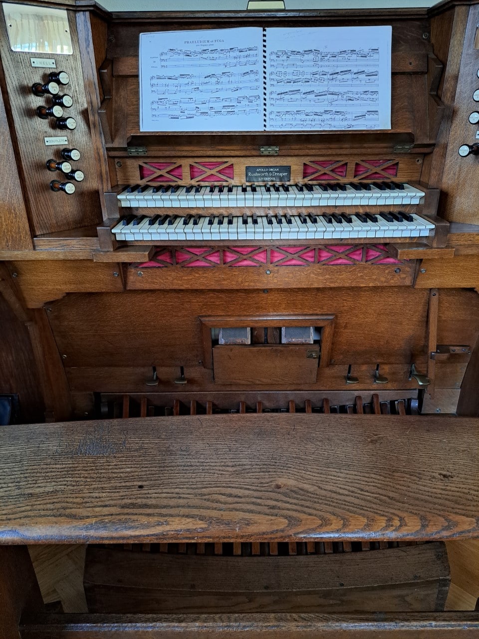 Rushworth & Dreaper bouwde in een onbekend jaar een nieuw zuigwindharmonium met 2 manualen en pedaal van het type Apollo. Het instrument is tegenwoordig eigendom van Gerrit te Rietstap uit Lochem (Gelderland). Het pedaalklavier is radiaal concaaf.