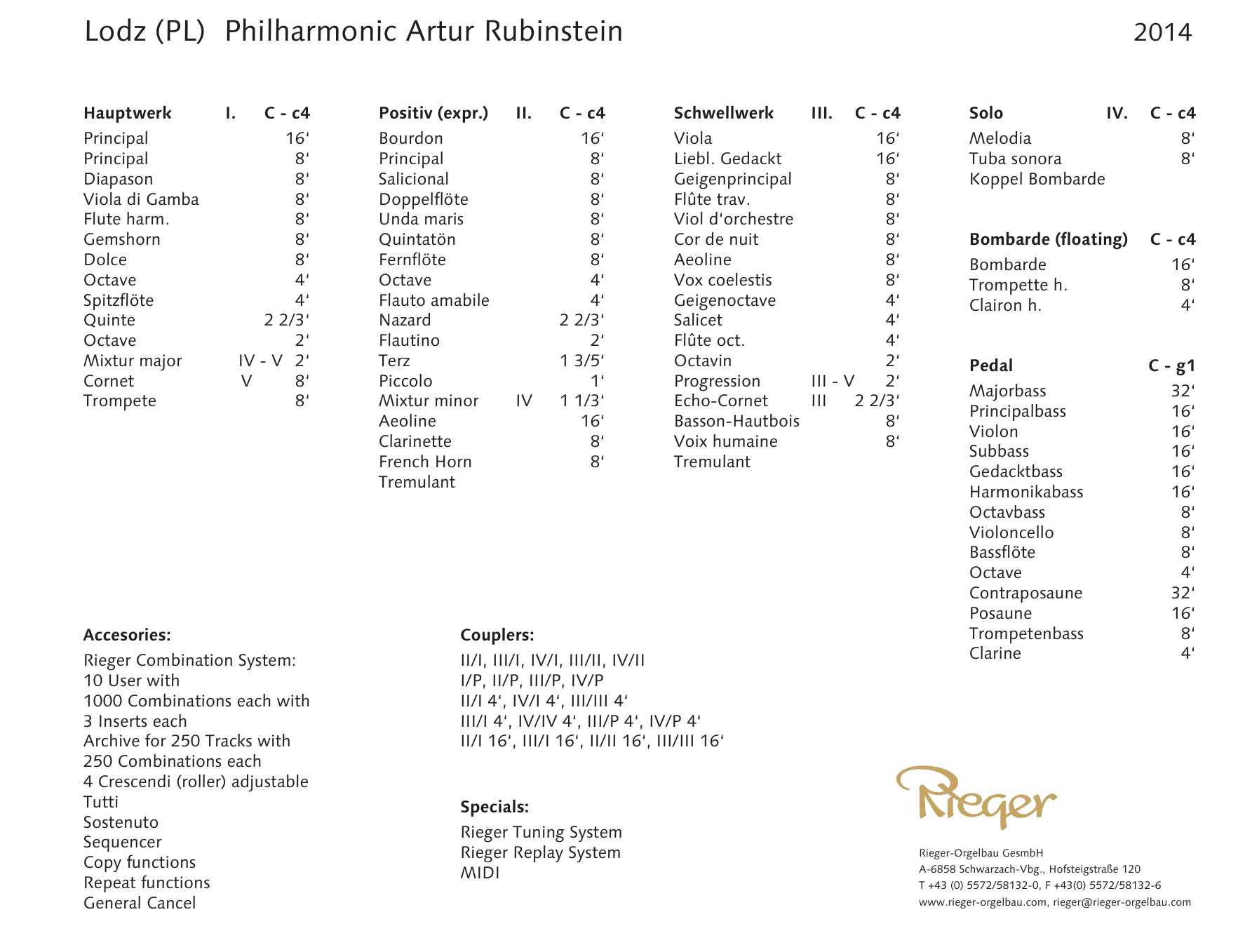 Rieger Orgelbau bouwde in 2014 een nieuw orgel met 4 manualen en een vrij pedaal voor de Philharmonie Arthur Rubinstein in Łódź (Województwo Łódzkiego) Polen.