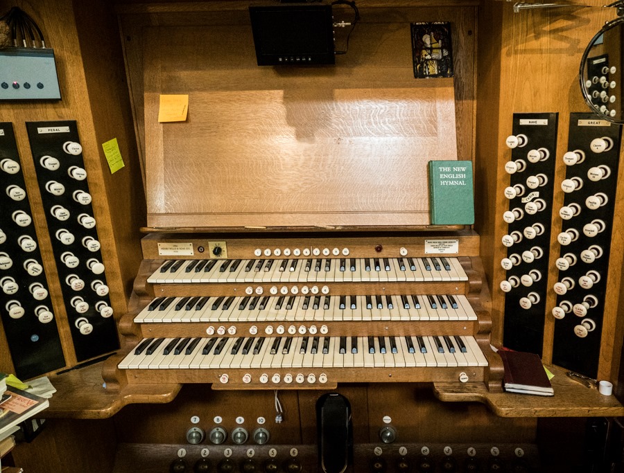 Swell Organ: C – c4 Open Diapason 8′, Lieblich Gedackt 8′, Salicional 8′, Vox Angelica 8′, Gemshorn 4′, Mixture 3 ranks – 1884/1930, Contra Posaune 16′ – 1930/1964/2000, Cornopean 8′ – 2000, Hautboy 8′, Vox Humana 8′ – 2000.