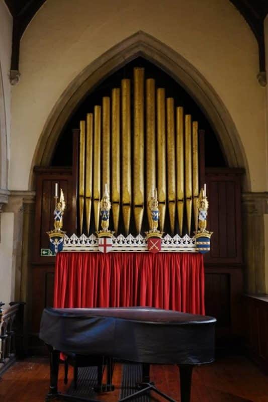 Great: C – g3 Open Diapason 8′, Stopped Diapason 8′, Principal 4′, Twelfth 2 2/3′, Fifteenth 2′, Mixture III, Trumpet 8′.