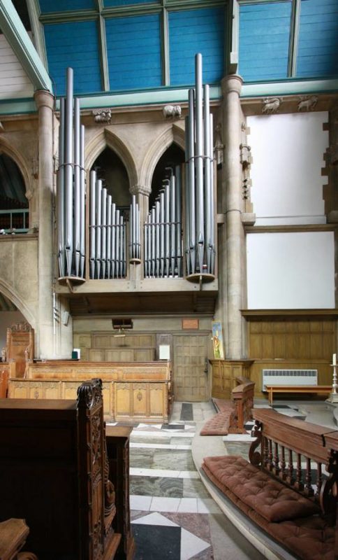 Swell: C – c4 Lieblich Bourdon 16′, Violin Diapason 8′, Rohr Flute 8′, Echo Gamba 8′, Voix Celestes 8′, Principal 4′, Fifteenth 2′, Mixture 3 ranks, Contra Fagotto 16′, Cornopean 8′, Oboe 8′, Clarion 4′.