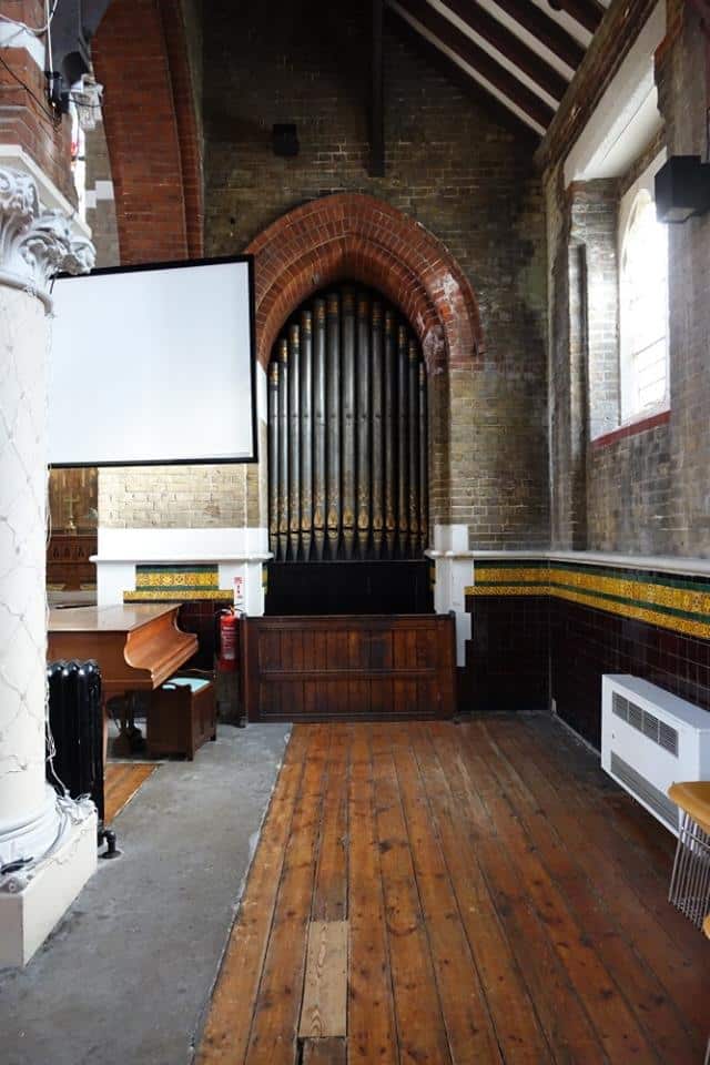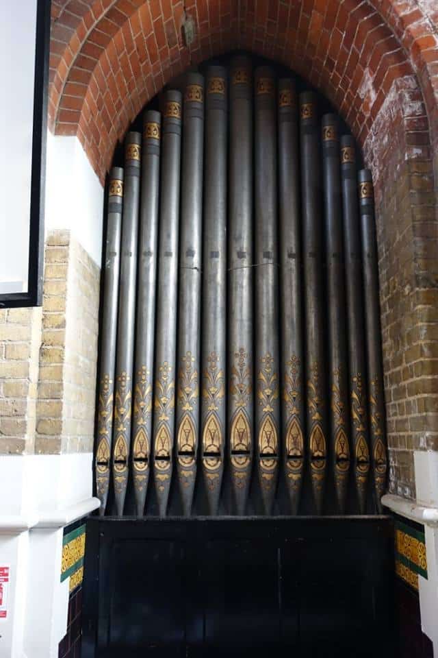 Swell: C – g3 (Enclosed), Gedact 8′, Dulciana 8′, Open Diapason 8′, Missing, Principal 4′, Piccolo 2′, Cornopean 8′, Hautboy 8′, Spare.