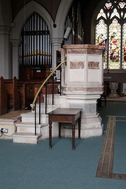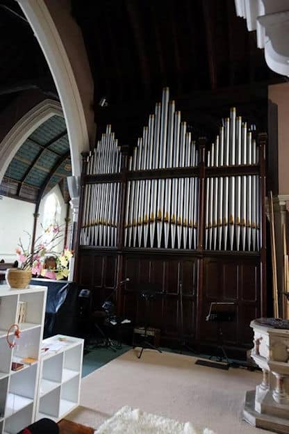 Swell: C – g3 Double Diapason 16′, Open Diapason 8′, Lieblich Gedact 8′, Salicional 8′, Vox Angelica 8′ TC, Gemshorn 4′, Flageolet 2′, Cornopean 8′, Hautboy 8′, Tremulant.