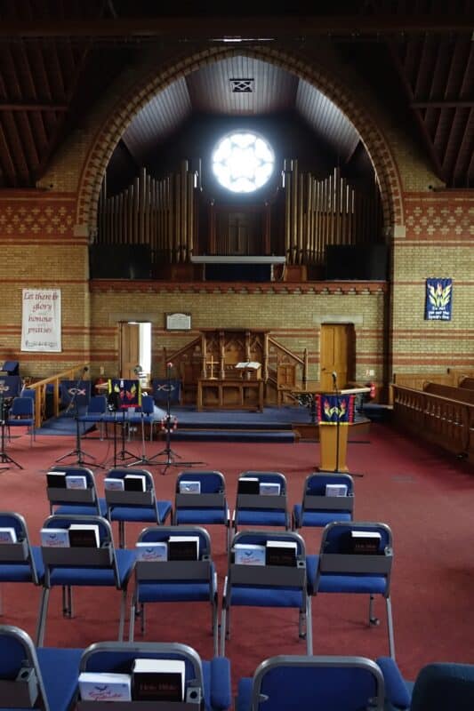 GREAT: C – c4 (61 TOETSEN) Large Open Diapason 8′, Small Open Diapason 8′, Clarabel 8′, Dulciana 8′, Harmonic Flute 4′, Principal 4′, Twelfth 2 2/3′, Fifteenth 2′.