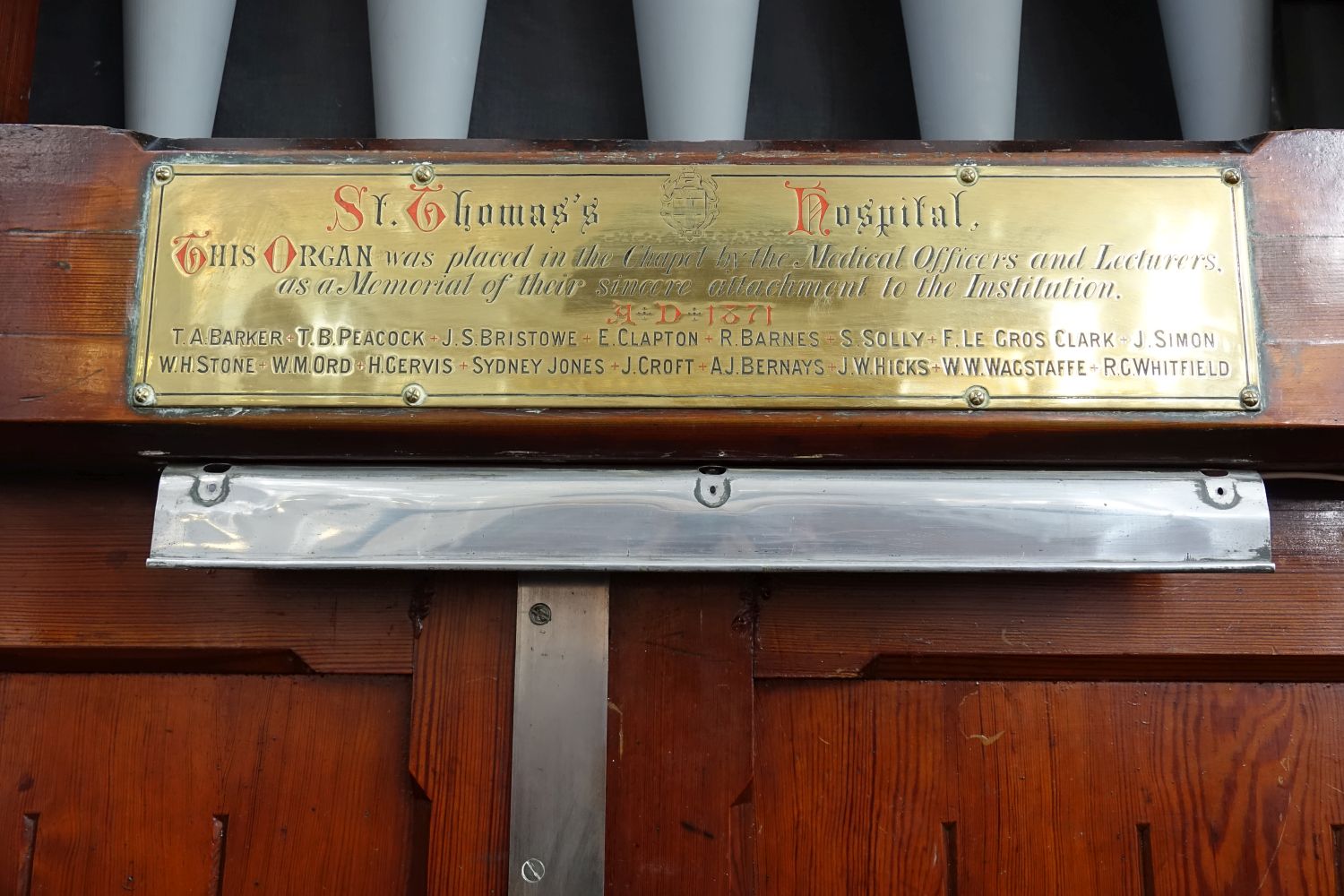Brindley & Foster bouwde in 1874 een nieuw mechanisch sleepladen-orgel met 33 stemmen, 3 manualen en een vrij pedaal voor het Saint Thomas Hospital in London (Westminster) Middlesex, UK. De toetstractuur van het Great en het Swell zijn later pneumatisch gemaakt.