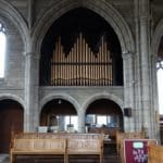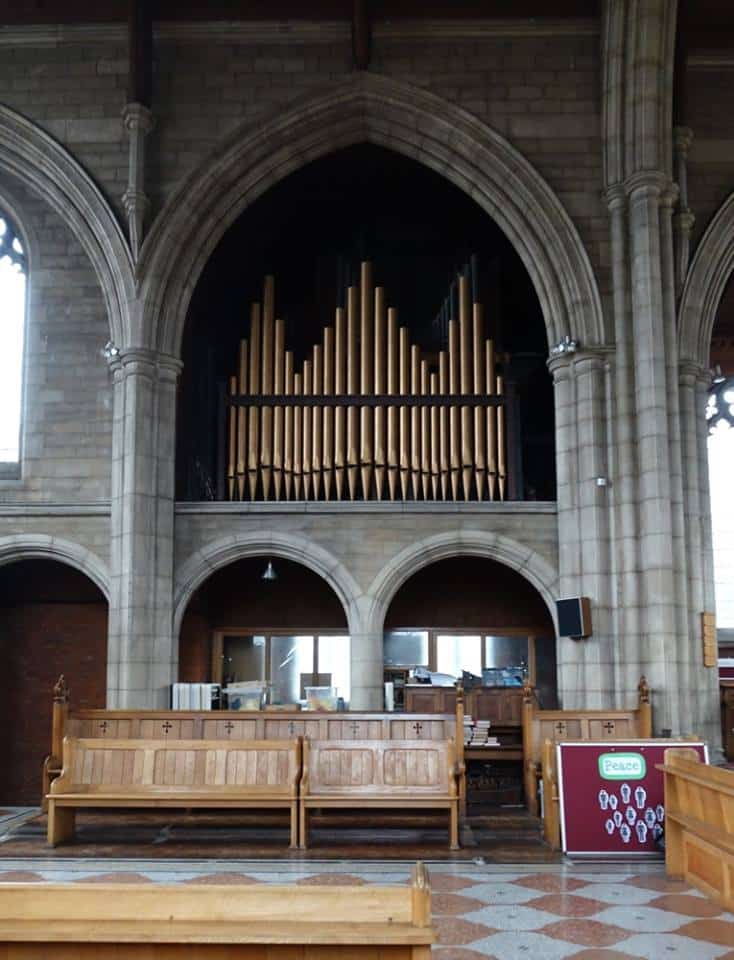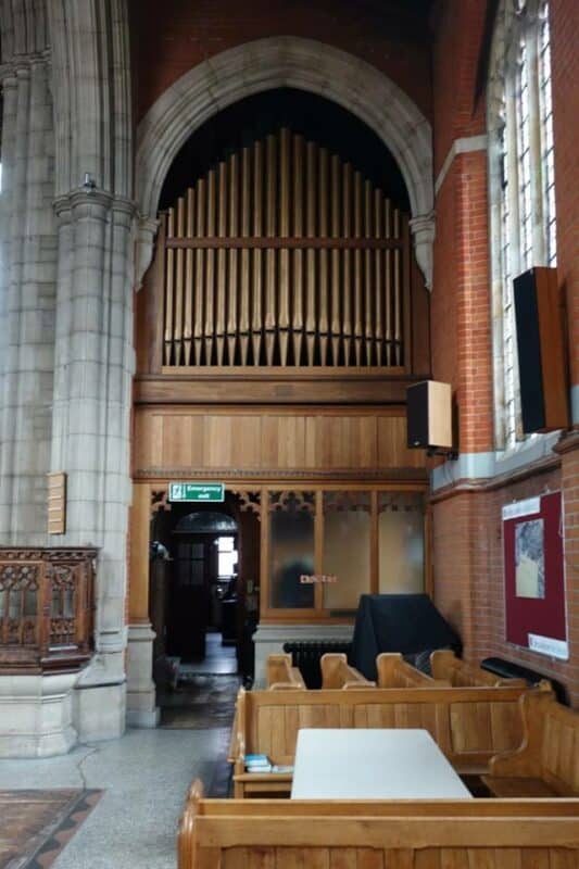 Great: Double Open Diapason 16′ (1948 nieuw), Open Diapason No. 1 8′, Open Diapason No. 2 8′, Stopped Diapason 8′, Dulciana 8′, Principal 4′, Harmonic Flute 4′, Fifteenth 2′, Trumpet 8′ (1948 nieuw – 5 bar wind).