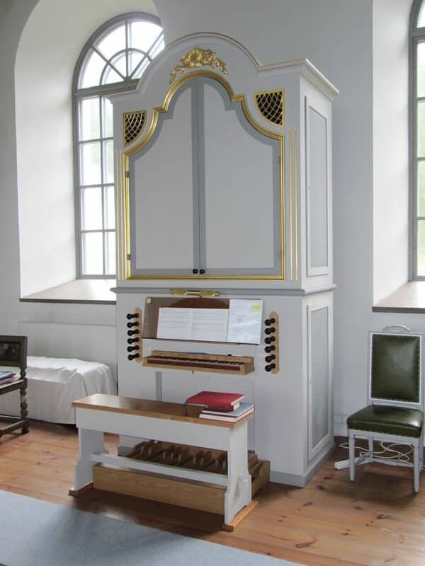 Manual (C-g3): 56 toetsen Trägedackt 8′ (B/D), Principal 4′ (B/D), Pommer 4′, Waldflöjt 2′, Nasat 1 1/3′, Aliquot 2 kor (1 1/3’+1′), Regal 8′ (B/D).