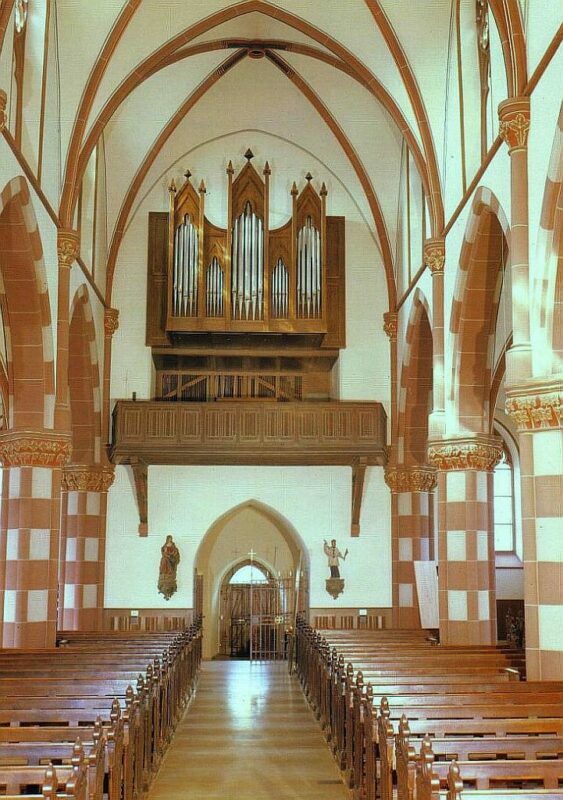 Schwellwerk: C-g3 Gedackt 8′, Salicional 8′, Principal 4′, Rohrflöte 4′, Nasard 2 2/3′, Waldflöte 2′, Terz 1 3/5′, Scharff 4 fach (1′), Tremolo.