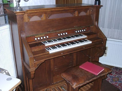 Een Mannborg pedaalharmonium uit ca. 1910. 2 klavieren en pedaal. Serienummer: 24019. 7 spels: 5 spels manuaal, 2 spels pedaal. Klavieromvang C-f3. Pedaalomvang C-d1. Keuze tussen (inklapbare) voetpedalen en windmachine.