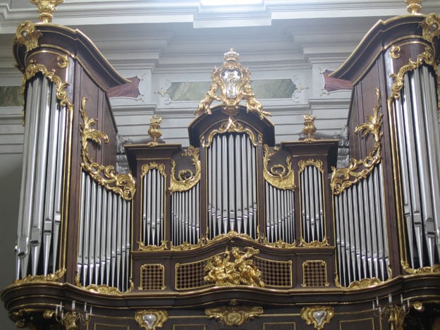 Pedal: (C-f1) Untersatz 32 Prinzipalbass 16 Subbass 16 Zartbass 16 Quinte 10 2/3 Holzoktav 8 Bartpfeife 8 Choralflöte 4 Großsesquialter 2f Hintersatz 4f Posaune 16 Trompete 8 Clarine 4 Cornett 2 |