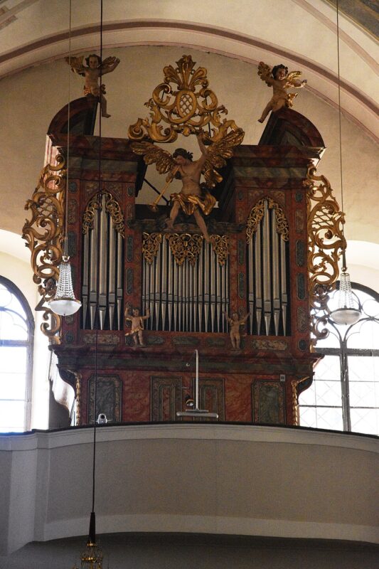 I. HAUPTWERK (C – f3) 54 TOETSEN: Prinzipal 8′ oud, Rohrflöte 8′ oud, Weidenpfeife 8′, Oktav 4′ oud, Flöte 4′ oud, Quinte 2 2/3′, Schwiegel 2′, Mixtur 5 fach.