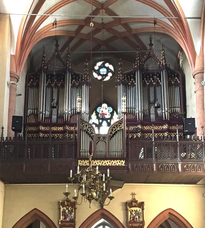 BRUSTWERK (C-c4): 61 TOETSEN Bordun 8′, Salicional 8′, Gamba 8′, Oktave 4′, Querflöte 4′, Waldflöte 2′, Larigot 1 1/3′, Oktave 1′, Zimbel 3 fach (1/2′), Rankett 16′, Schalmei 8′, Tremulant.