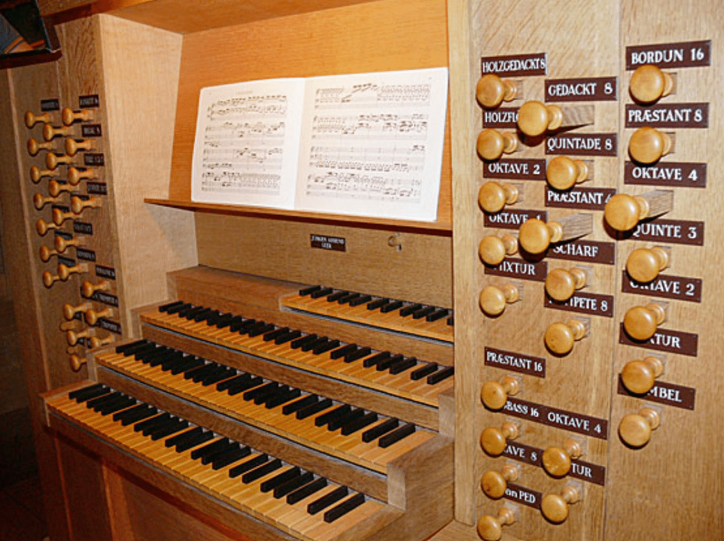 BRUSTWERK (C – f3) 54 TOETSEN: Holzgedackt 8′, Holzflöte 4′, Oktave 2′, Terz 1 3/5′, Quinte 1 1/3′, Oktave 1′, Mixtur 3 fach, Rankett 16′, Regal 8′.