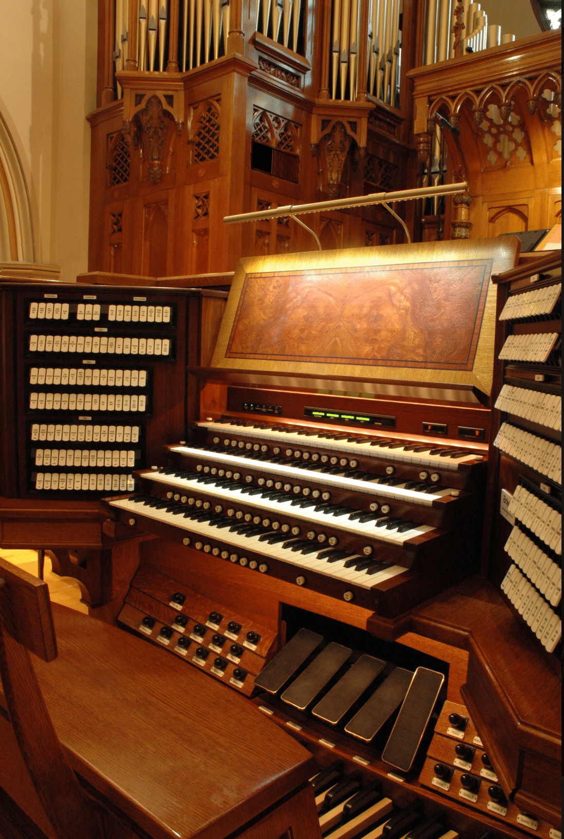 SOLO (C – c4) 61 TOETSEN: Bass Viole 16′, Grand Diapason 8′, Violoncello 8′ – extension, Violoncello Celeste 8′, Bourdon 8′, Octave Major 4′, Flûte Ouverte 4′, Plein Jeu 7 ranks (2′), Bombarde 16′, Trompette 8′, English Horn 8′, French Horn 8′, Clairon 4′ – extension, Tremulant, Chimes – from Swell.