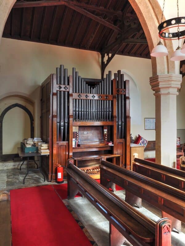 MANUAL (C – f3) 54 TOETSEN: Open Diapason 8′, Lieblich Gedeckt 8′, Dulciana 8′, Principal 4′, Twelfth 2 2/3′, Fifteenth 2′.