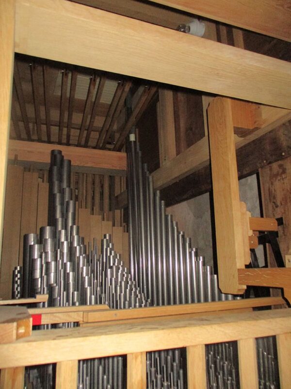 POSITIF (C – g3) 56 TOETSEN: Bourdon 8′, Flûte 4′, Nazard 2 2/3′, Quarte 2′, Tierce 1 3/5′, Cymbale 3 rangs, Hautbois 8′, Cromorne 8′.