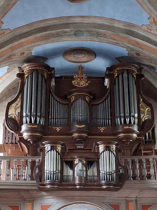 GRAND ORGUE (C – f3) 54 TOETSEN: Bourdon 16′, Principal 8′, Bourdon 8′, Octave 4′, Flûte Douce 4′, Quinte 2 2/3′, Flageolet 2′, Superoctave 2′, Tierce 1 3/5′, Cornet 5 rangs (discant), Fourniture 3 rangs, Cymbale 2 rangs, Trompette 8′ (B/D).