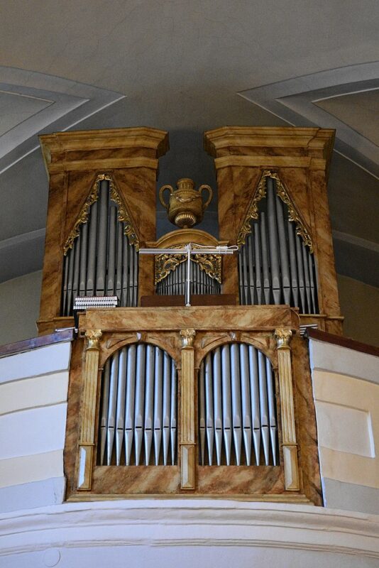 MANUAL (C – f3) 54 TOETSEN: Prinzipal 8′, Gedeckt 8′, Viola 8′, Dolce 8′, Oktav 4′, Flöte 4′, Cornett 3 fach (2 2/3′).