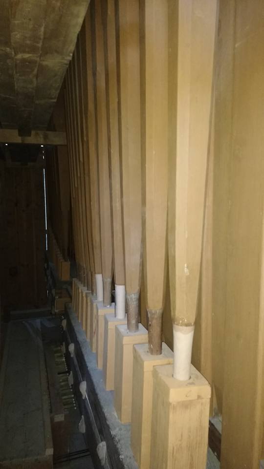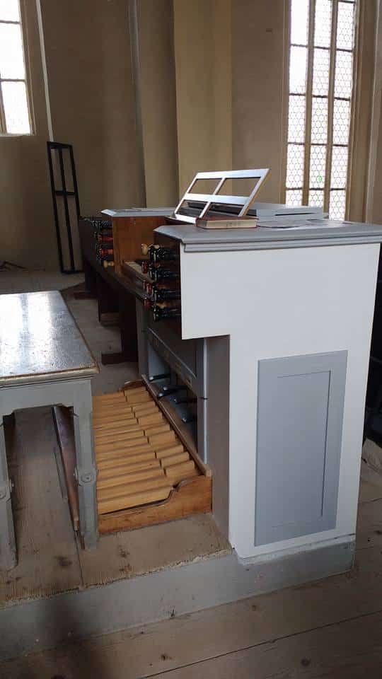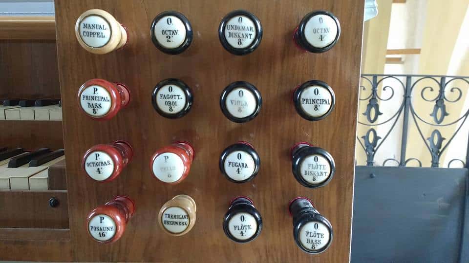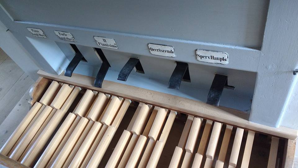 Speelhulpen: Decriscendo (Tritt), Piano Hauptwerk Oberwerk (Tritt), Forte Hauptwerk Oberwerk (Tritt), Hauptwerk Pianisimo (Tritt), Sperventil Hauptwerk (Tritt), Sperrventil Oberwerk.