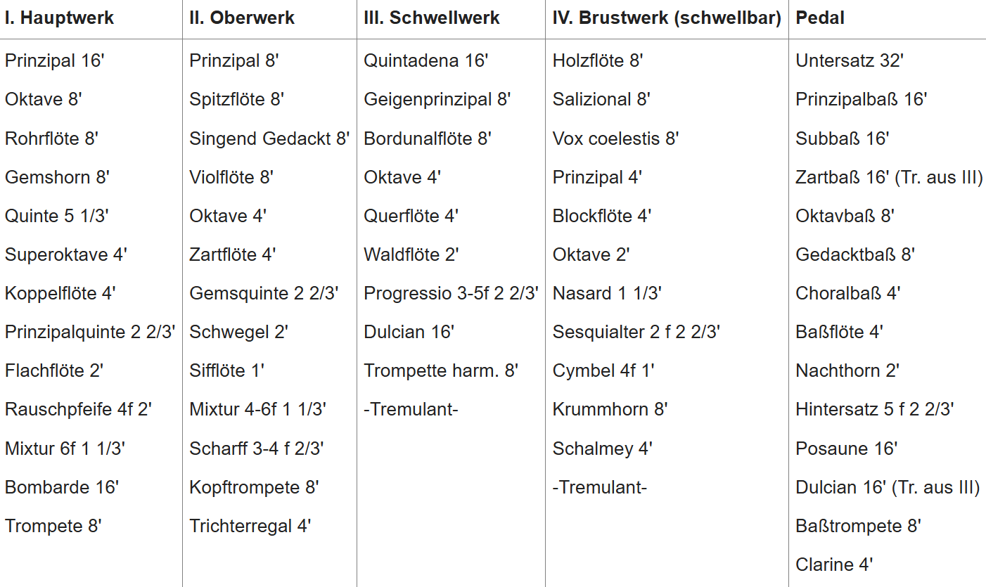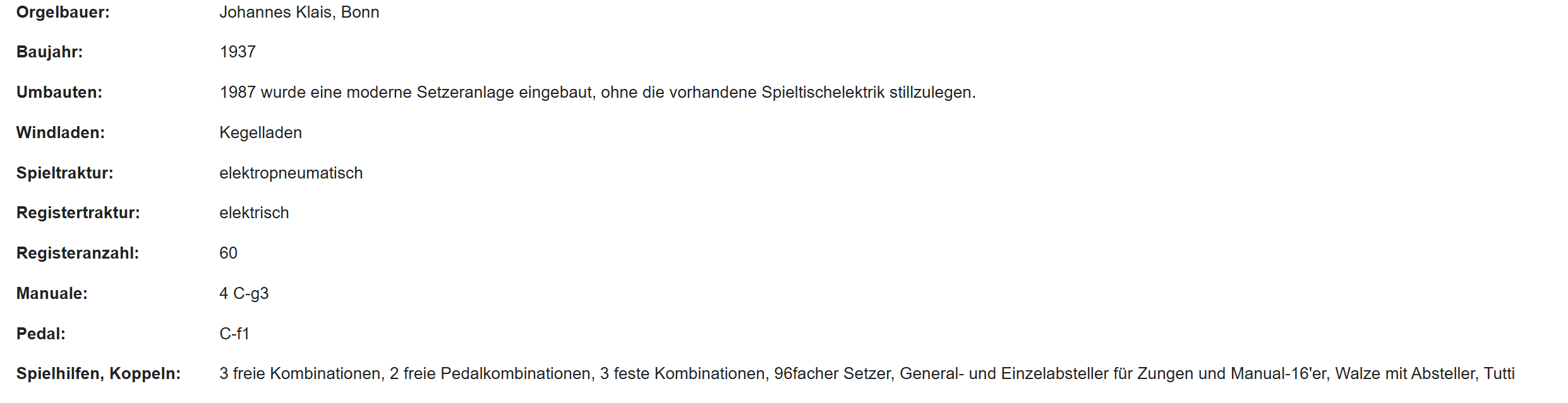 In 1937 bouwde Klais Orgelbau een nieuw kegelladen-orgel met elektro-pneumatische toetstractuur, elektrische registertractuur, 60 stemmen, 4 manualen en een vrij pedaal voor de Abteikirche in Münsterschwarzach (Bayern) Duitsland. In 1987 werd een moderne Setzerinstallatie geplaatst.