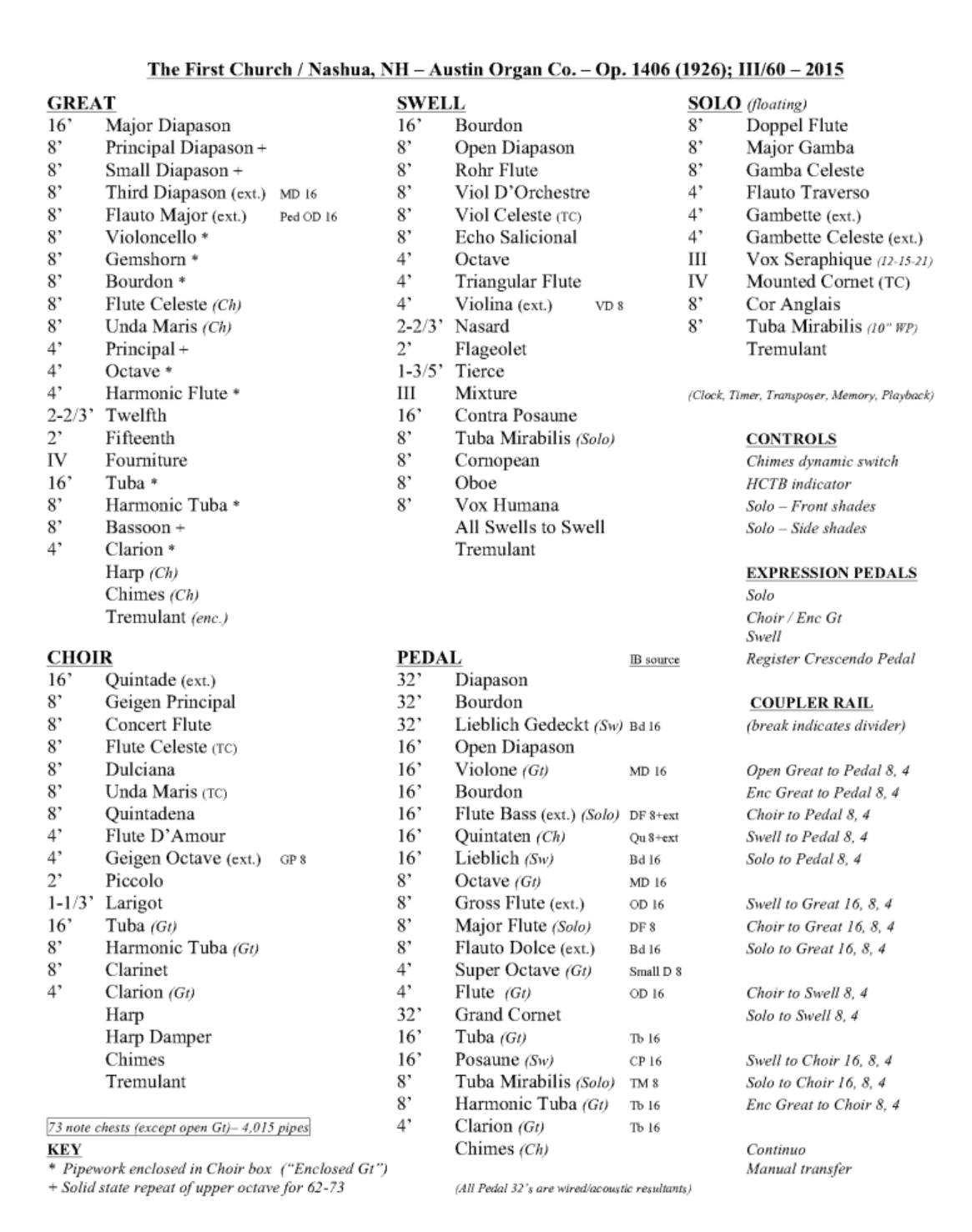 Austin Organ Company bouwde in 1926 opus 1406. Een nieuw orgel met 4 manualen en een vrij pedaal voor de First Congregational Church UCC in Nashua (New Hampshire) USA. Het pedaalklavier is radiaal concaaf.