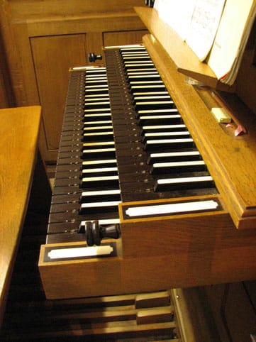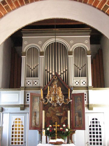 Oberwerk: Gedackt 8 Blockflöte 4 Prinzipal 2 Nasat 1 1/3 Scharf 3fach Sesquialter 2’ Krummhorn 8 Tremulant |