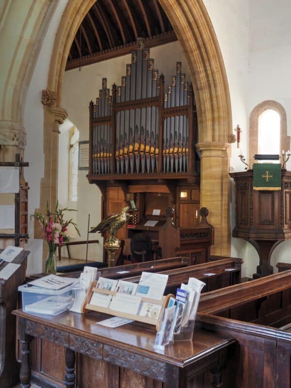 GREAT (C – g3) 56 TOETSEN: Open Diapason 8′, Dulciana 8′, Flauto Traverso 4′.