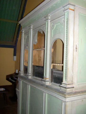 Nebenzüge/ farbige Porzellanplättchen/ schwarze Schrift (alle in einer Reihe) Orgel muss restauriert werden.