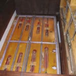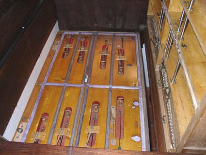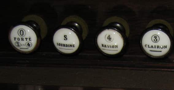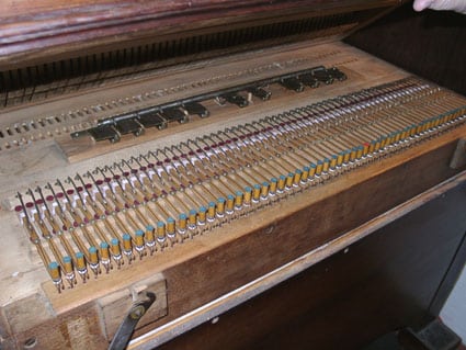 Rechts een detail van het blok met de tongenregisters. Goed te zien zijn twee reeksen tongen.