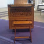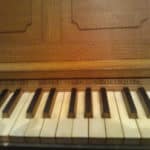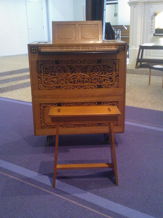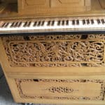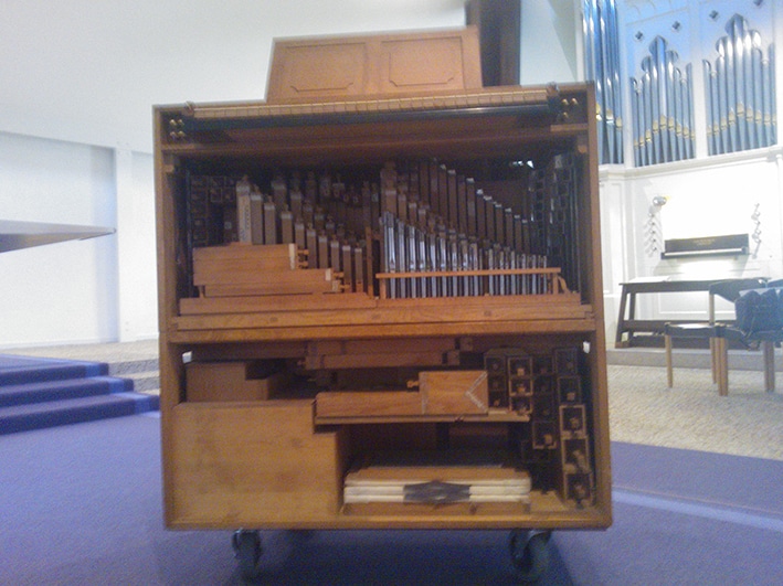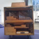 Hier is het kistorgel te zien aan de kant van het klavier. Duidelijk zijn hier twee kassen te zien. De onderkant met de windvoorziening en de bas van de holpijp. De bovenkant met windladen mechanieken en overige pijpen. Links en rechts nog deels liggend op het klavier. Het kistorgel was in particulier bezit. In 2015 is het verkocht en naar de Grote of Sint Stevenskerk in Nijmegen verplaatst.