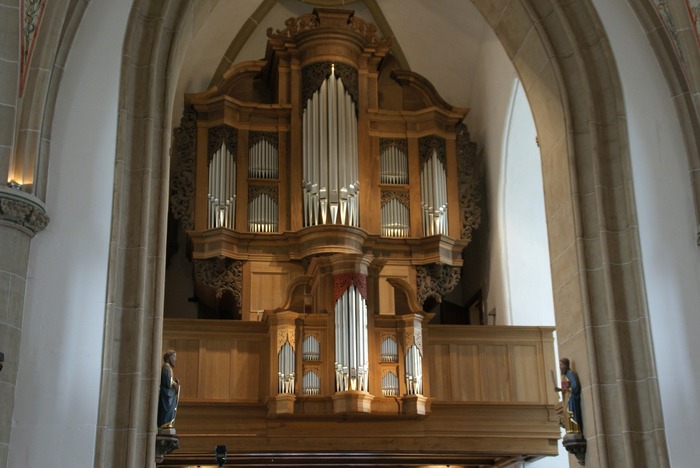 Nordwalde is een kleine gemeente in het Landkreis Steinfurt in het Münsterland (Nordrhein-Westfalen) Duitsland. Het kerkorgel in de Katholische Pfarrkirche Sankt Dionysius is een fraai voorbeeld van een synthese tussen een originele barokke orgelkast en een nieuw gebouwd orgel in de passende Westfaals-Noord-Duitse barokstijl. De parochie verwierf eerst het orgelkast van Henrich Mencke uit 1711, die tot de jaren 60 in de stiftskerk in D-Freckenhorst had gestaan en sindsdien in opslag was opgeslagen in afwachting van betere tijden. Veel snijwerk en het rugpositief waren verloren gegaan, wat later aan de hand van oude foto’s werd gereconstrueerd. In 2000 gaf de parochie orgelbouwer Dieter Bensmann (D-Steinfurt-Borghorst) de opdracht om er een nieuw orgel voor te bouwen. De basis voor het nieuwe orgel was de in 1706 contractueel overeengekomen specificatie van het Mencke-orgel. Het voltooide instrument is sinds 2000 een beschermd historisch monument. Sleepladen. Mechanische tractuur voor zowel toetsen als registers. II / 25 P. De toonhoogte is a’ = 440 Hz. De stemmingstemperatuur is Kellner.