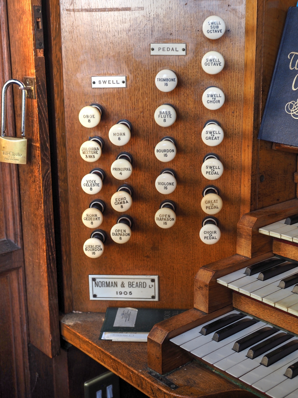 PEDAL (C – f1) 30 TOETSEN: Open Diapason 16′, Violone 16′ – 1919, Bourdon 16′, Bass Flute 8′ – extension, Trombone 16′ – prepared for.