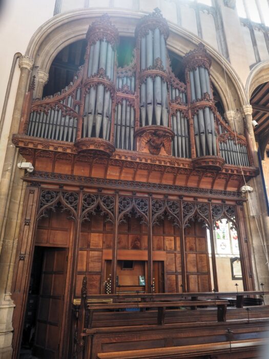 GREAT (C – g3) 56 TOETSEN: Large Open Diapason 8′, Small Open Diapason 8′, Hohl Flote 8′, Principal 4′, Harmonic Flute 4′, Twelfth 2 2/3′, Fifteenth 2′, Trumpet 8′.
