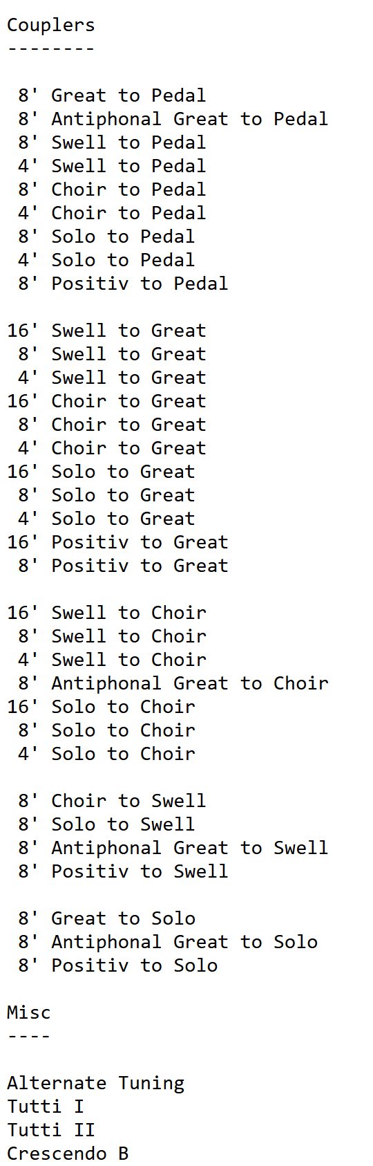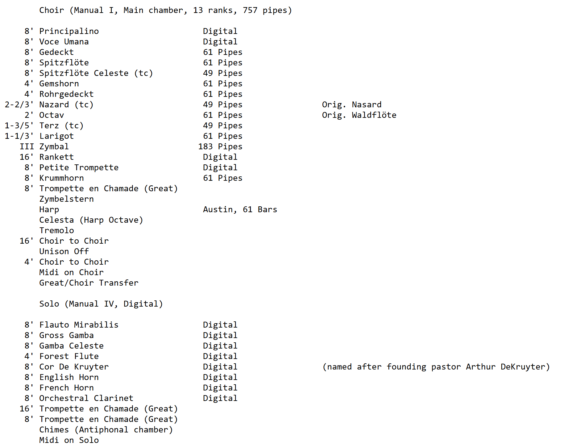 Austin Organs bouwde in 1978 opus 2616. Een nieuw orgel met 4440 pijpen, 80 ranks (pijporgel), 40 ranks (digitaal), 4 manualen en een vrij pedaal voor de Christ Church in Oak Brook (Illinois) USA. Het pedaalklavier is radiaal concaaf.