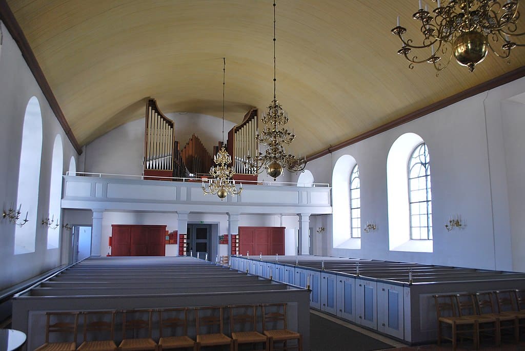 MANUAL II (SVÄLLVERK): Rörflöjt 8′, Salicional 8′, Principal 4′, Blockflöjt 4′, Spetskvint 2 2/3′, Piccolo 2′, Ters 1 3/5′, Scharf 3 chor, Oboe 8′.