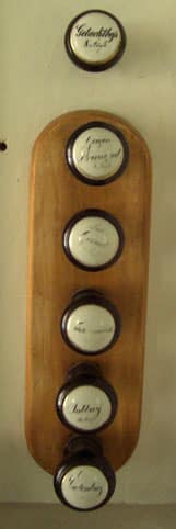 11 Zug-Register (einreihig/ schwarz/ weiße Porzellanplättchen/ Goldrand/ schwarze Schrift)