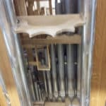 Rückpositiv: CDEFGA – g”a” Quintadena 8′, Prinzipal 4′, Rohrflöite 4′, Oktawa 2′, Rohrflöite 2′, Quinta 1 1/2′, Scharp 3 fach, Cymbel 3 fach, Krumbhorn 8′, Gembshorn + Zincken 4′ + 8′ – Gembshorn discant, Zincken bas, Tremulant.
