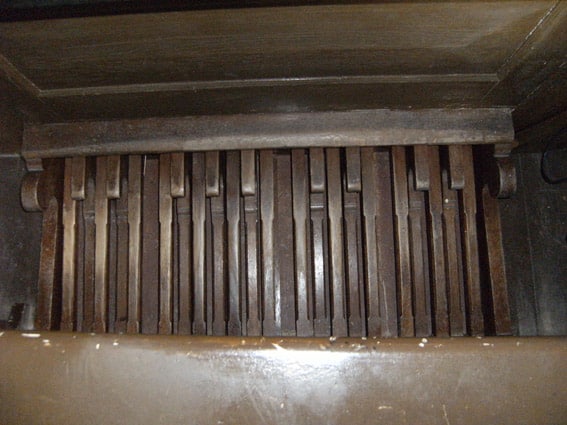 Hoofdwerk: C – f3 Bourdon 16′, Quintadena 16′ (discant), Prestant 8′, Roerfluit 8′, Octaaf 4′, Quint 3′, Octaaf 2′, Trompet 8′ (gedeeld).