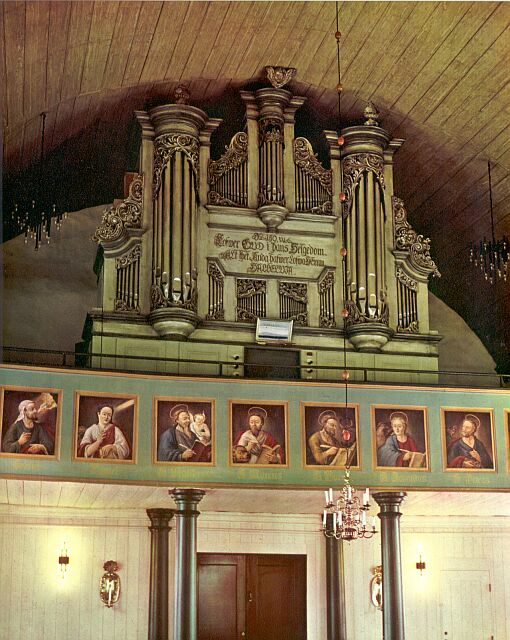Manual: C – c3 Untersats 16′ (gedeeld), Principal 8′ (gedeeld), Gedackt 8′, Oktava 4′, Täckflöjt 4′, Kvinta 2 2/3′, Oktava 2′, Scharff III – 1777/1788, Trumpet 8′ (gedeeld), Vox Humana 8′ (discant), Trumpet 4′ (bas), Tremulant.