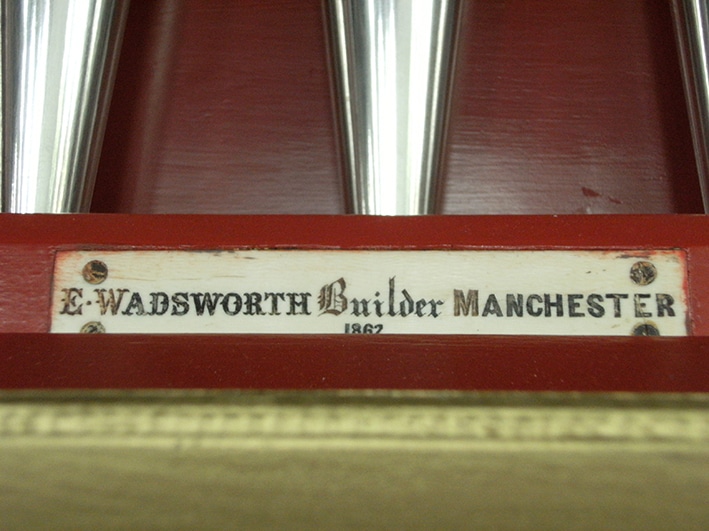 Great Organ: C – g3 Open Diapason 8′ – C-c 1886, Dulciana 8′ – 1886; C-H uit Clarabella, Clarabella 8′ – 1886, Principal 4′, Fifteenth 2′.