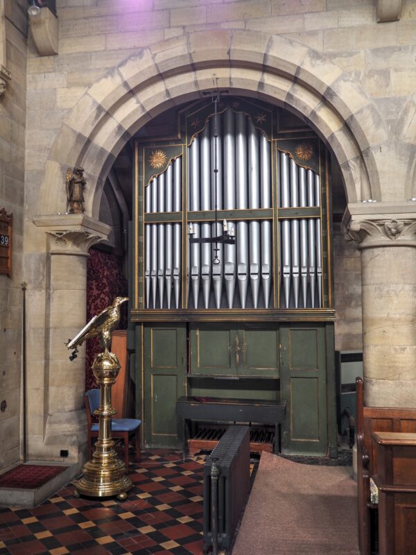 Great Organ (C-g3): 56 toetsen Open Diapason 8′, Stop Diapason 8′, Principal 4′, Suabe Flute 4′ (TC), Fifteenth 2′.
