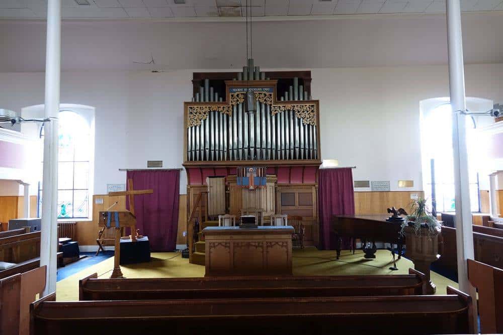 Great: C – g3 Open Diapason 8′, Stop Wald Flute 8′, Dulciana 8′, Principal 4′, Harmonic Flute 4′, Twelfth 2 2/3′, Fifteenth 2′, Clarionet 8′ TC.