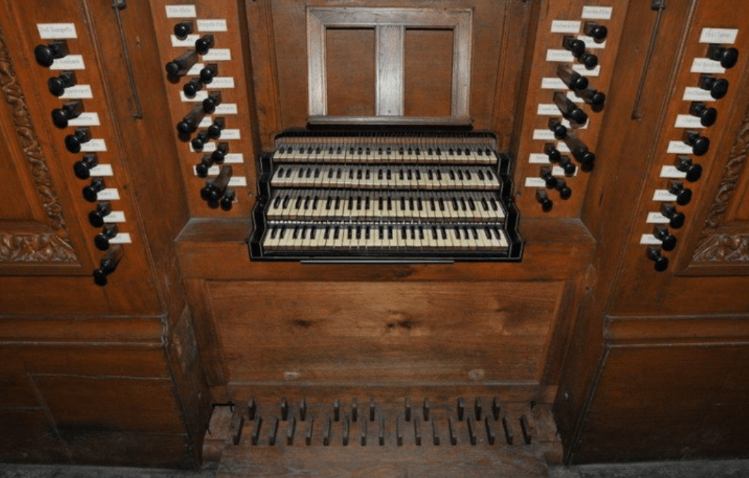 GRAND-ORGUE (C – e3) 53 TOETSEN Montre 16′, Bourdon 16′, Montre 8′, Bourdon 8′, Prestant 4′, Grand Tierce 3 1/5′, Nazard 2 2/3′, Doublette 2′, Quarte de Nazard 2′, Tierce 1 3/5′, Cornet 5 rangs, Fourniture 5 rangs, Cymbale 4 rangs, 1ère Trompette 8′, 2ème Trompette 8′, Voix Humaine 8′, 1ère Clairon 4′, 2ème Clairon 4′.