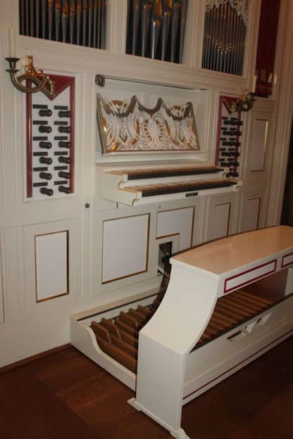 HOOFDWERK (C-g3): 56 TOETSEN Prestant 8′ – 2004, Roerfluit 8′, Octaaf 4′, Fluit 4′, Quint 3′, Octaaf 2′, Mixtuur II sterk, Dulciaan 8′, Tremulant.