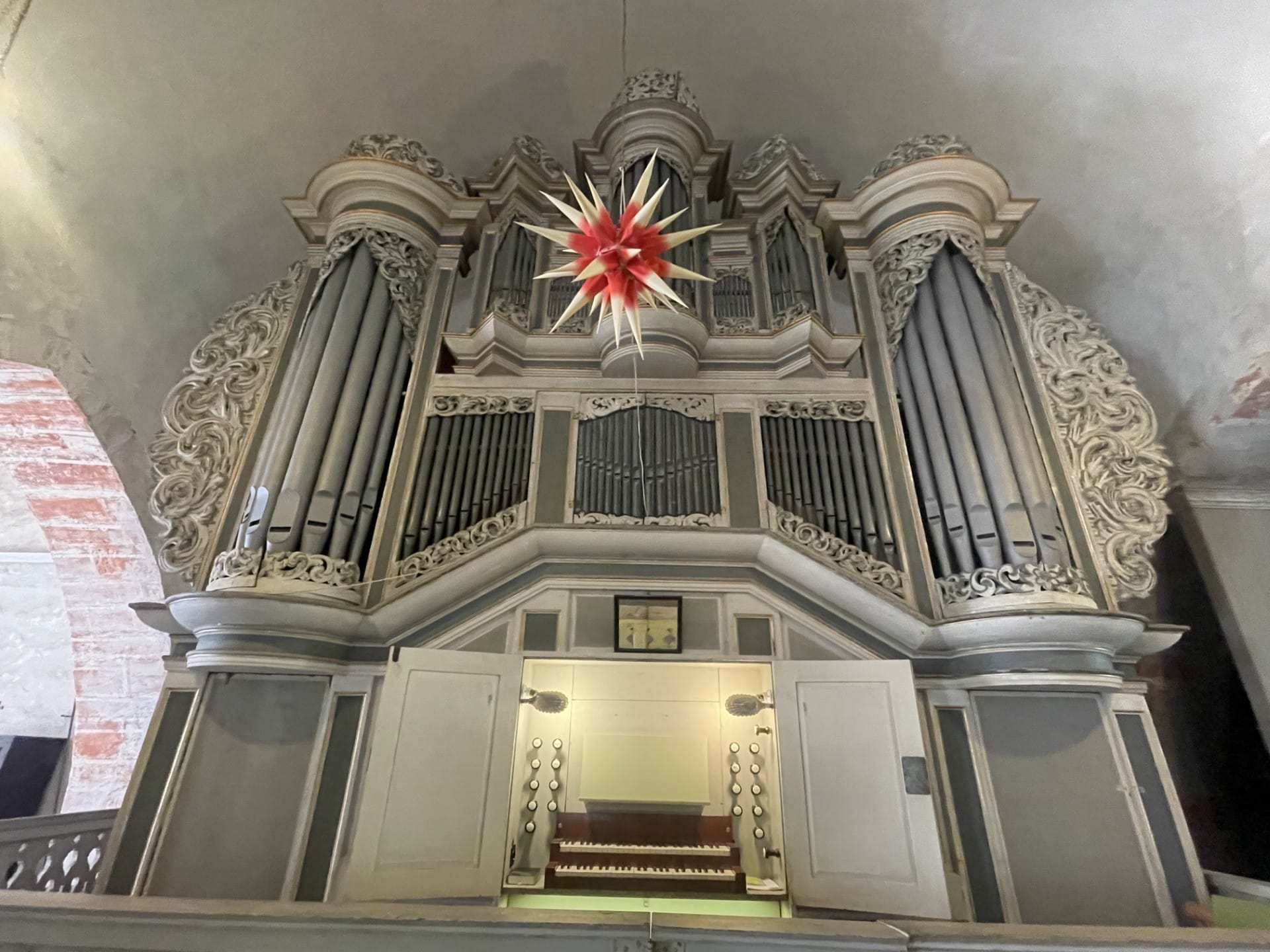 MANUAL I – HAUPTWERK (C – f3) 54 TOETSEN: Gedacktpommer 16′, Prinzipal 8′, Rohrflöte 8′, Oktave 4′, Gemshorn 4′, Nasat 2 2/3′, Oktave 2′, Mixtur 4fach 1 1/3′
