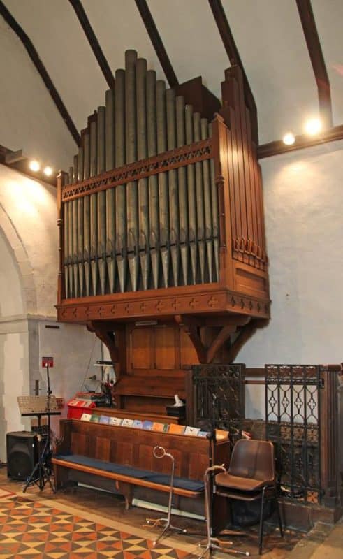 Manual: C – g3 (in zwelkast) Open Diapason Bass 8′ (niet in zwelkast), Open Diapason Treble 8′ (niet in zwelkast), Rohr Flute 8′, Gamba 8′, Principal 4′, Harmonic Flute 4′.